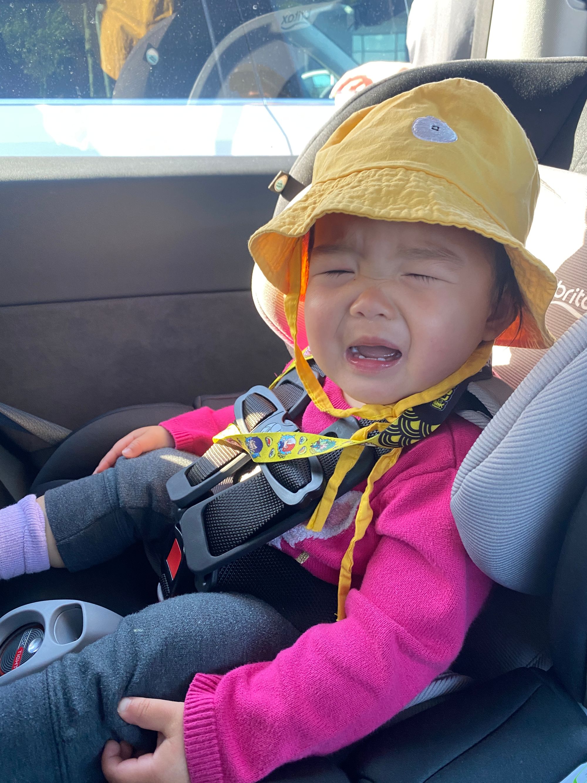 Please enjoy this photo of Junie looking like an old tourist grandma with her multicolored outfit, bucket hat, and key lanyard, while complaining about something.