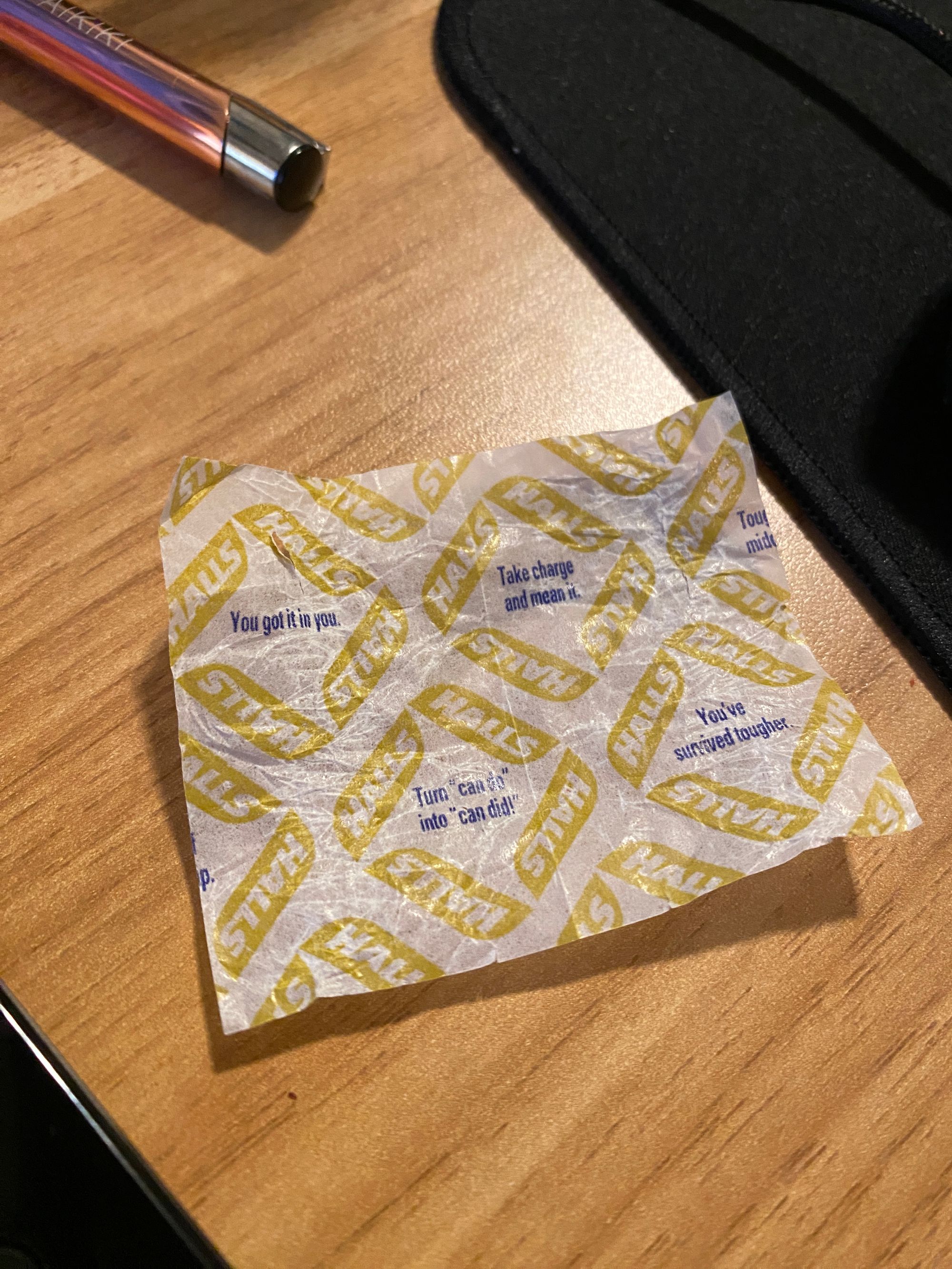 Argh, this has been a sucky week. Needless to say my exercise goals did not get met this past week. I have to be resilient. I have to be strong. I am none of those things, and sometimes trying to be makes me feel even more stressed and anxious. Maybe I can take the advice and encouragement of my cough drop wrapper to heart this week.