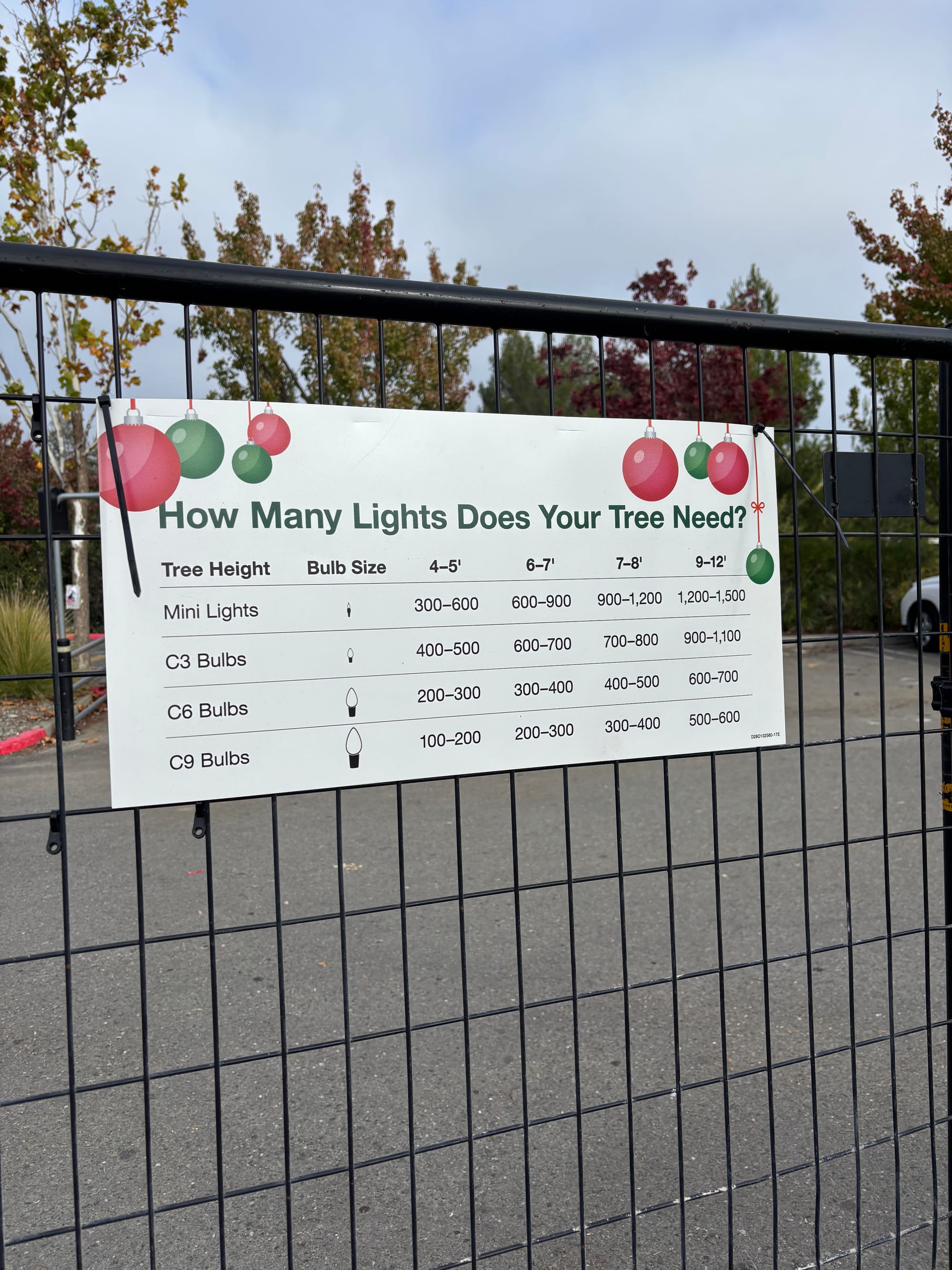 Holiday decorations are going up in full force - spending a lot of money this year to get some new things, but telling myself it's investment for future holidays to come. Did you know that a tree needs this many lights (which translates to several HUNDREDS of feet)??!! Will report back when we finish decorating our tree on whether or not this chart was accurate or severely overestimating the number of lights needed.