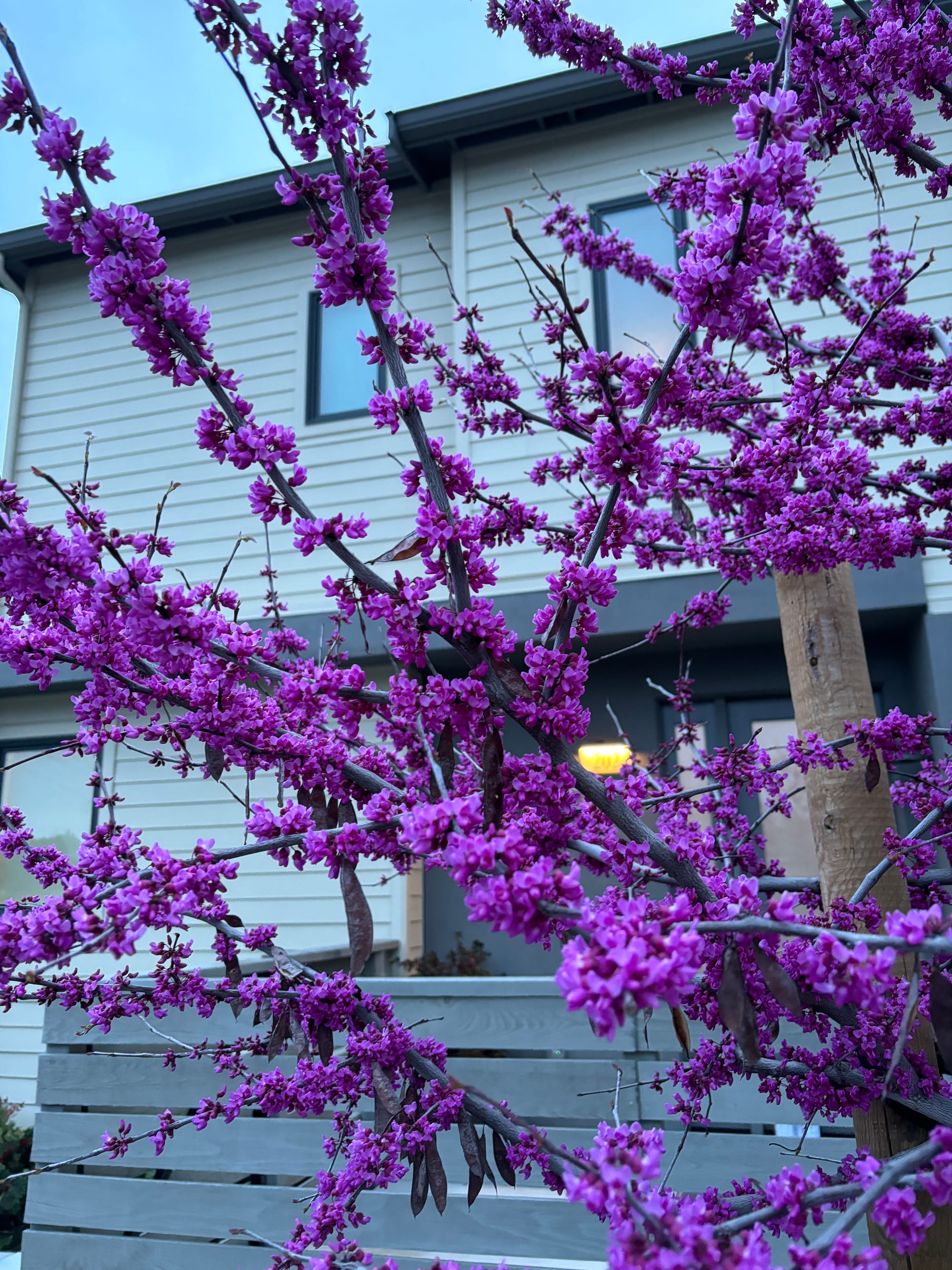 Spring is here! I keep talking myself out of buying rainboots for Junie, who loves to jump in puddles, because I keep thinking that we are going to be done with rain for the season... but sadly looks like we may still have rain this week. Sigh. Some of the blossoms on the tree have already gotten blown off or fallen off, but Junie and I found this very pretty purple one on our walk the other night. The other perk of spring and summer is getting to have some outside time after dinner!